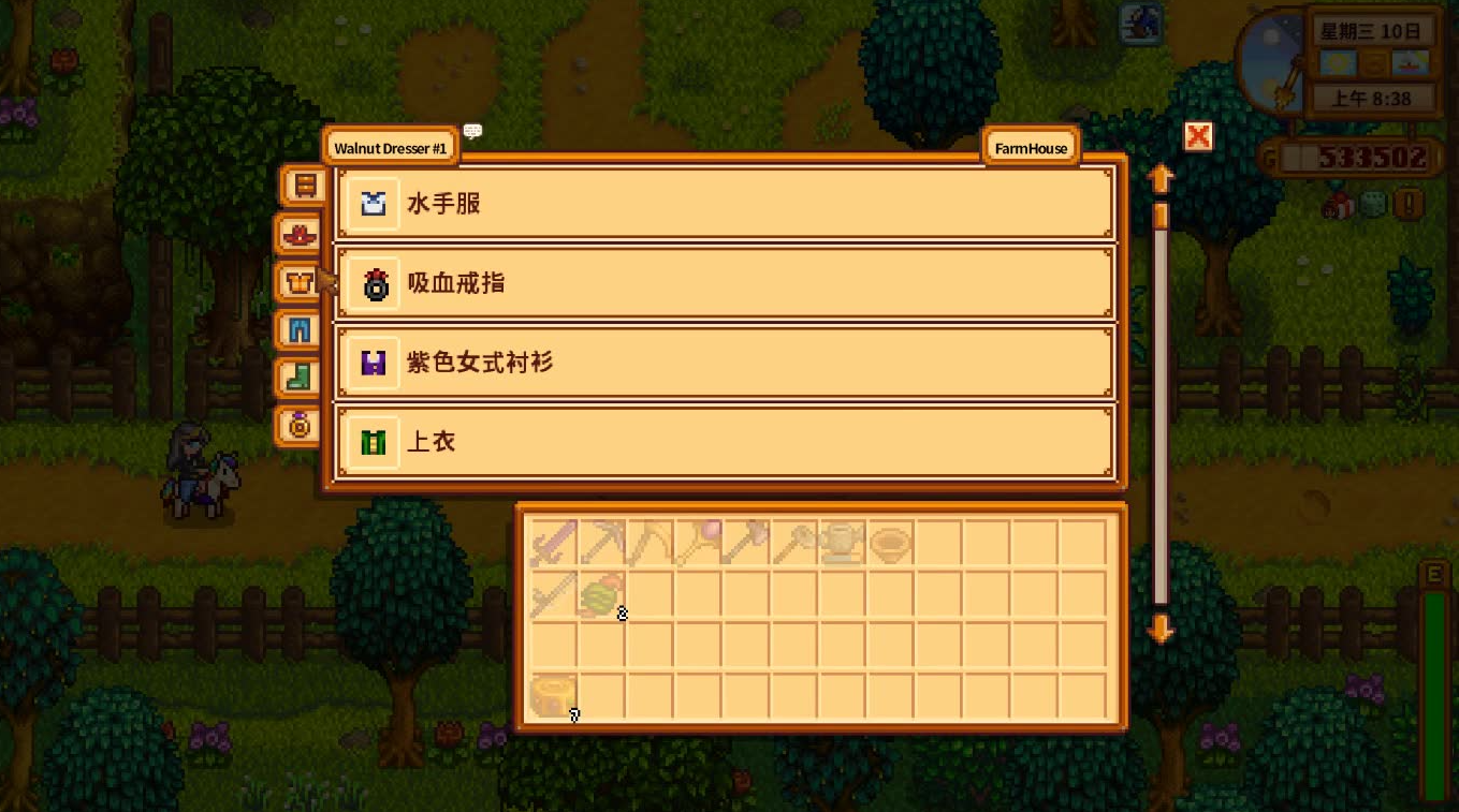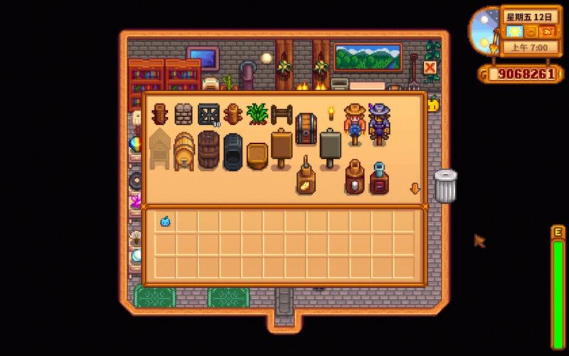 升级背包是另一种解决存储问题的方式。初始背包仅12格,可在皮埃尔杂货店花费2000金币首次扩容至24格,第二次扩容需10000金币至36格。背包扩容优先级较高,尤其在采矿或采集资源时能显著提升效率。若金币不足,可优先制作临时宝箱过渡,再将常用工具与资源分类存放。
